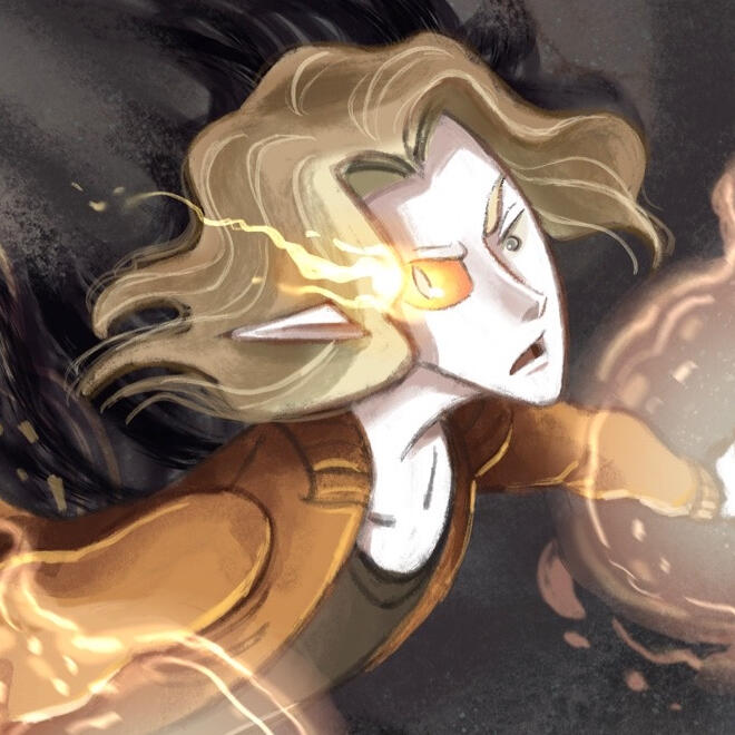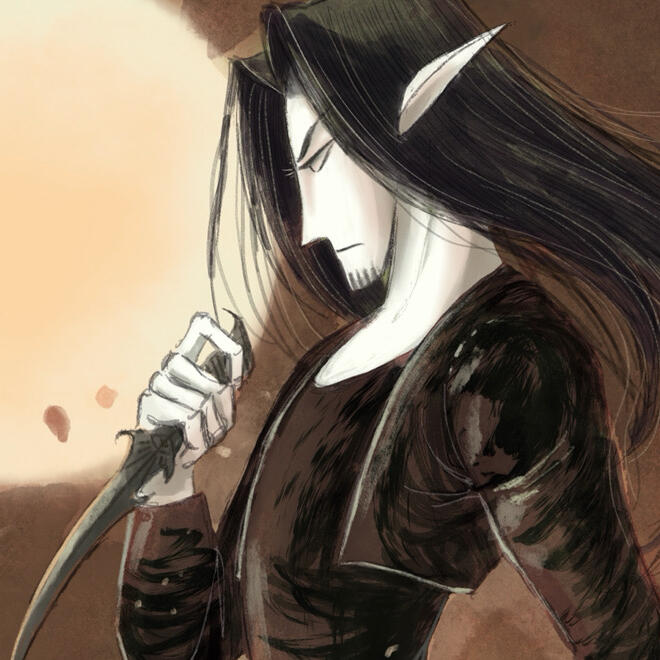Judas is one of the rare elves exceedingly gifted with magic. Though he is family to Fen, he didn’t grow up in the same kingdom, and was instead raised primarily on Earth by his mother. As a result, Judas is a “diaspora elf” with more roots in western Earth culture than the kingdom Fen lived in.He did eventually relocate to that kingdom and worked in secret with Fen to eventually end the rule of the Queen there. To deal with such exceptional might, Judas willingly took on a demon and now struggles to retain control of that demon, rather than be consumed by it.He has lived in isolation for decades since the destruction of the kingdom, adjusting to the new normal of having a demon in his soul manifesting visibly as a demon eye. He still harbors major resentment against Fen for things done during the destruction of the kingdom, the cost to family, and the things unsaid. However, when Fen finally appears on his doorstep, he is willing to see whether this means things can move forward, or whether they are trapped in a difficult, irreconcilable relationship.
